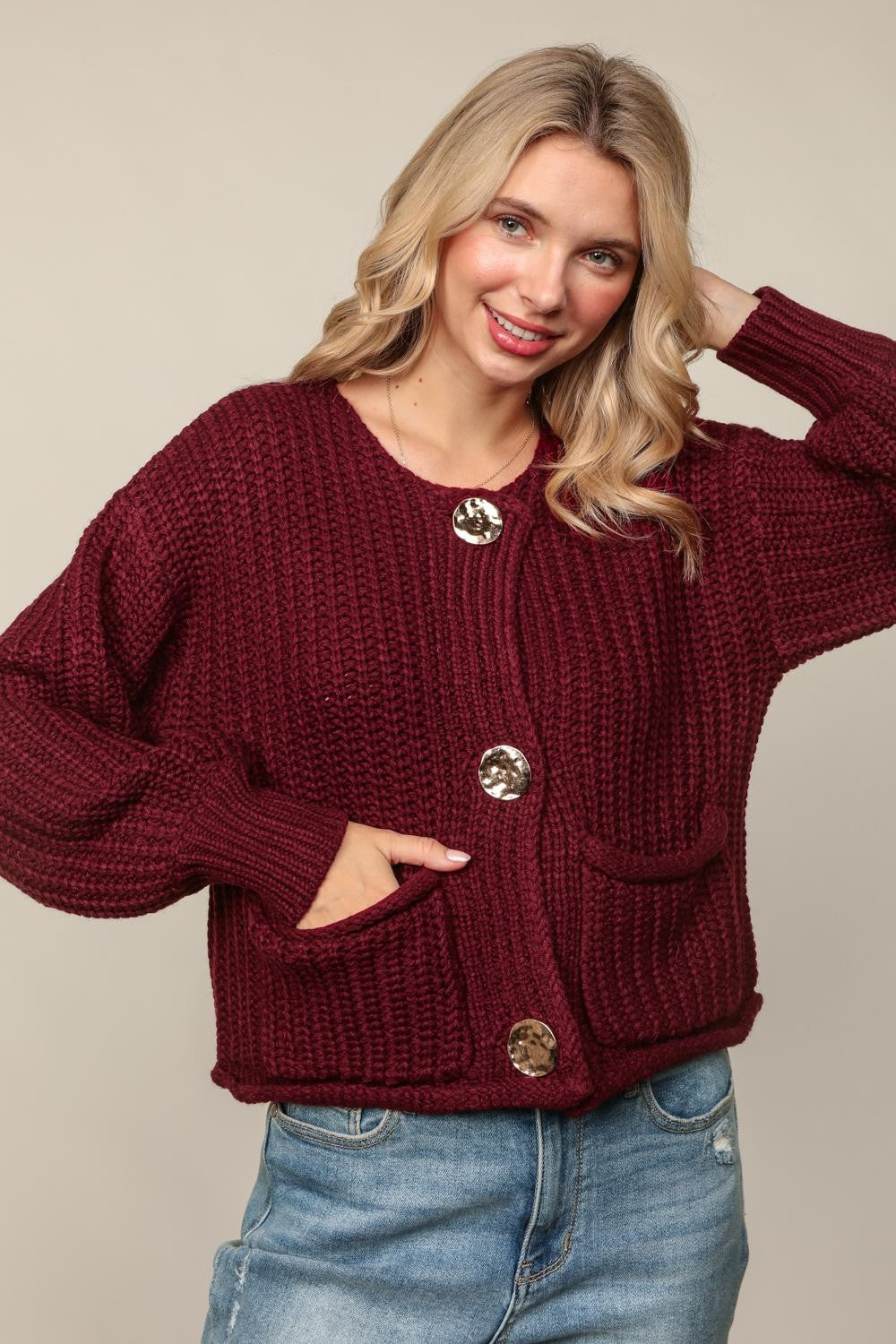 This maroon knitted cardigan is the perfect blend of comfort and style! Featuring a classic design with gold buttons, it's crafted from soft knit fabric. Pair it with jeans or dress it up - it's a versatile must-have!