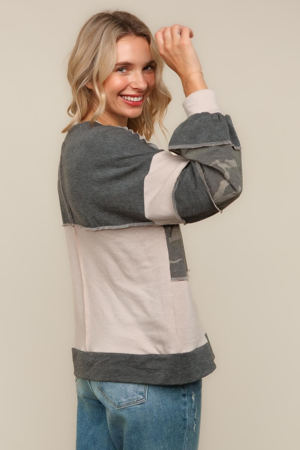 ! This top uniquely combines classic camouflage print with soft gray fabric and delicate pink accents, creating a visually dynamic and fashionable look. Pair it with jeans or leggings for a casual yet trendy outfit, and add sneakers or boots to complete your look. This top is perfect for making a statement!