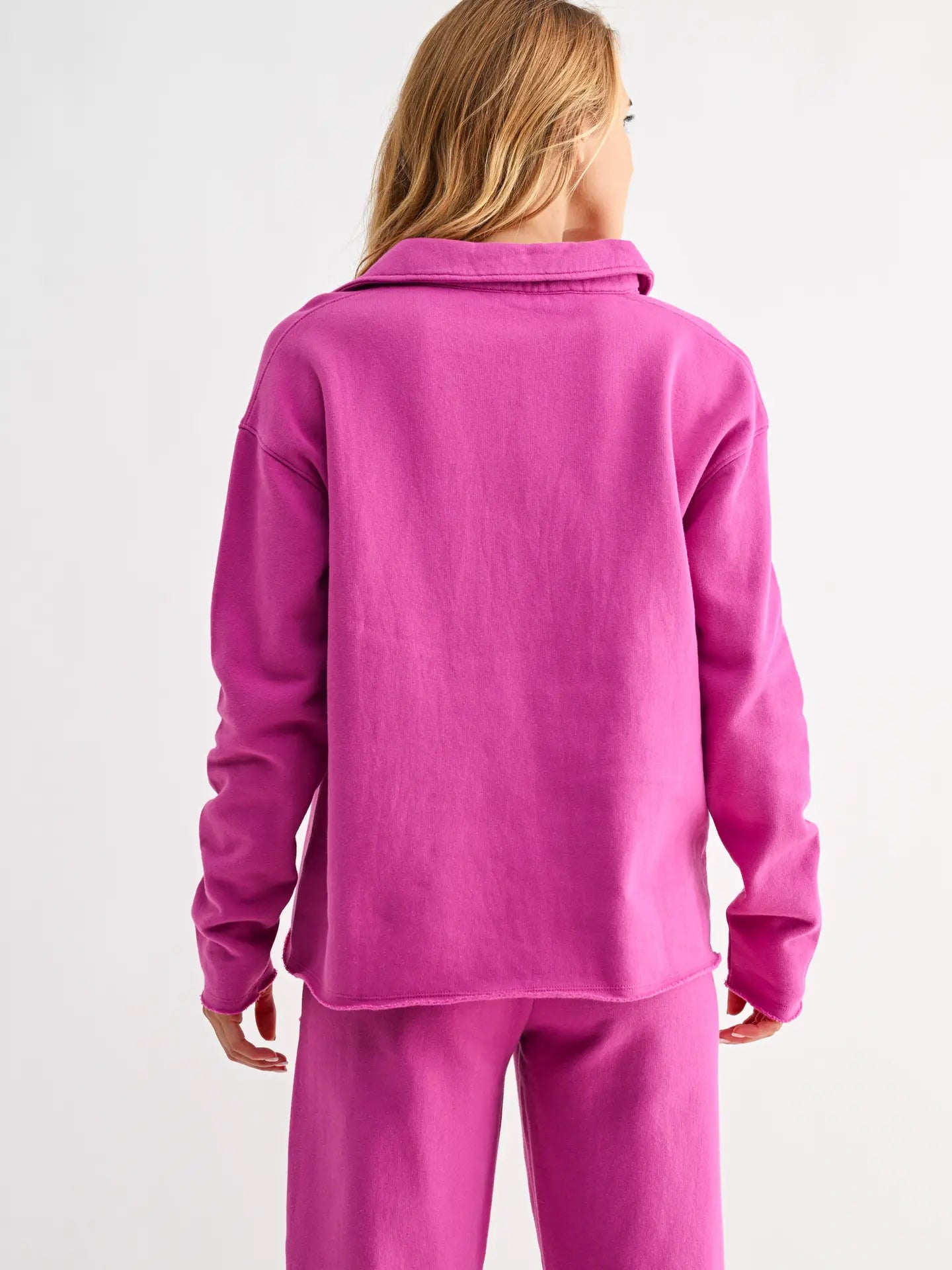 Step into comfort and style with this vibrant fuchsia sweatshirt. Featuring a relaxed fit, a chic collared neckline, and long sleeves, this is perfect for lounging or casual outings. Made from soft, high-quality fabric, this sweatshirt combines fashion and functionality effortlessly. Brighten up your wardrobe with this bold and cozy look!