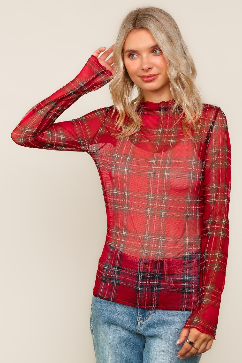 This mesh plaid top features a classic red and black plaid pattern with a lightweight, breathable mesh fabric that adds a modern twist. The long sleeves are airy and comfortable, making this your perfect layering piece. A combination of the bold plaid design and the sheer mesh material gives it a stylish, edgy look that's both trendy and versatile.