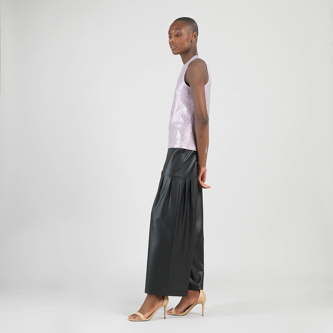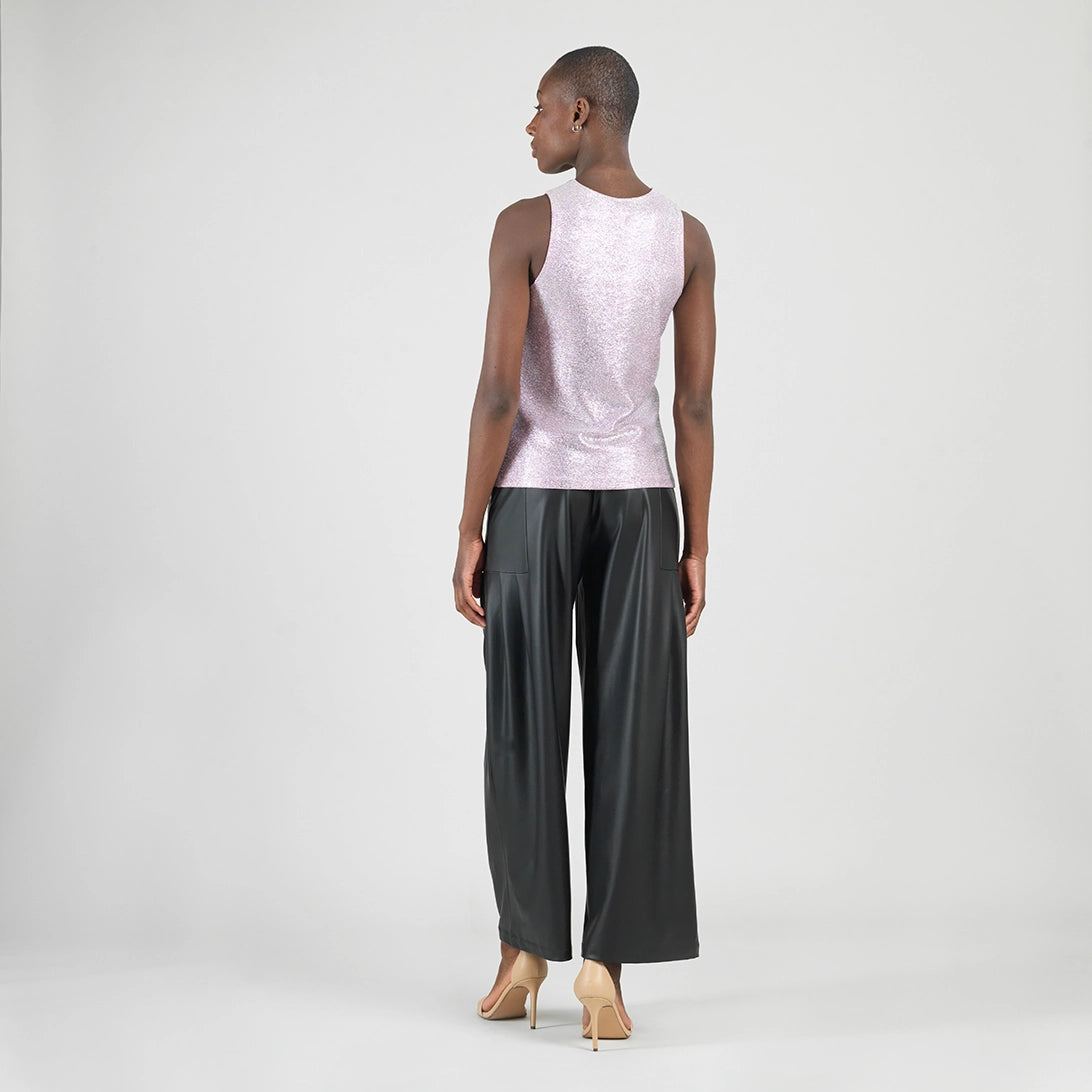 The top is a pink/lavender sleeveless design with a sparkling glitter finish that adds a touch of glamour. It’s scoop neckline, gives it a stylish look. The fabric is lightweight and perfect for warm weather or layering.