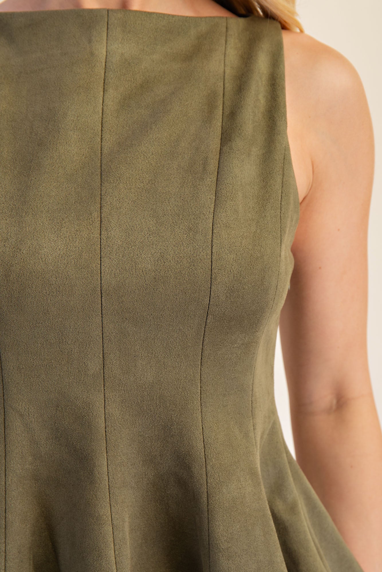 This sleeveless fitted top features a flattering peplum silhouette that cinches at the waist and flares out slightly, creating a feminine and elegant shape. Its olive-green color adds a sophisticated touch, and the smooth, tailored fit highlights the figure beautifully.🙌🏼