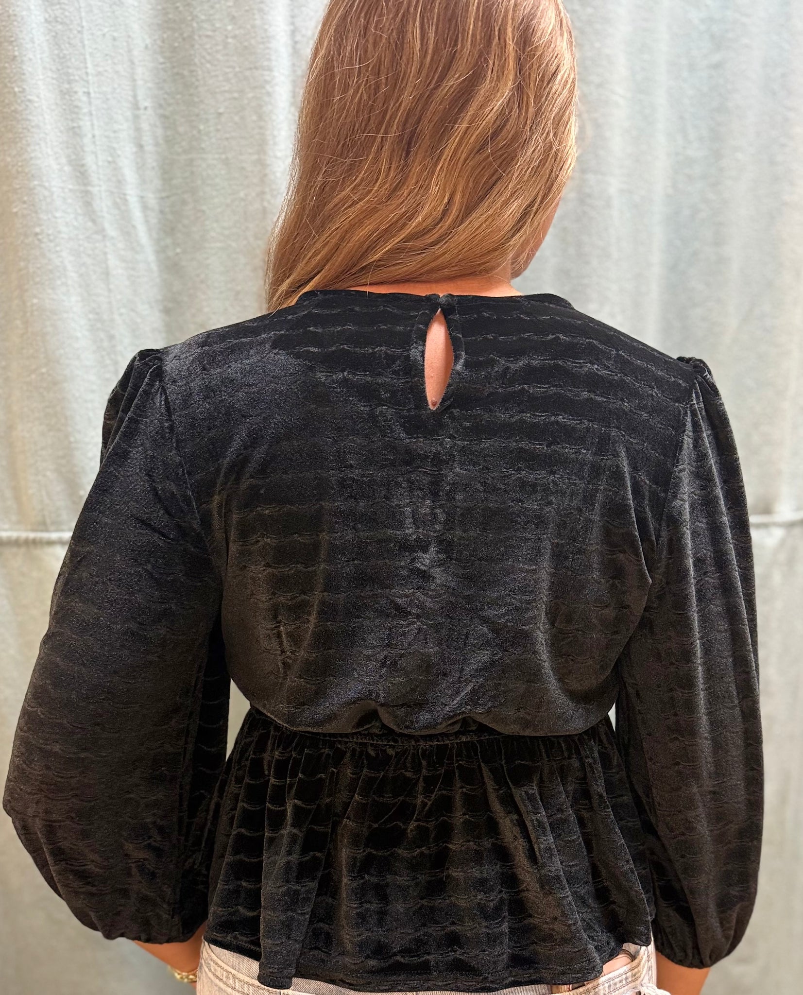 Elevate your wardrobe with this stunning velvet top! Featuring a flattering silhouette, delicate pearl and bow accents, and a keyhole neckline adorned with two charming black bows embellished with sparkling gems-one at the neckline and another just below the keyhole. The black, velvet fabric adds a rich touch of sophistication. Perfect for a night out or a chic daytime look.